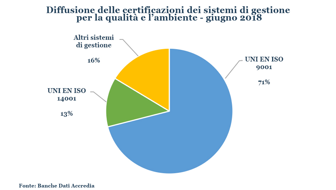 Anche dall’analisi della ISO Survey, condotta annualmente da ISO (International Organization for Standardization) per rilevare la diffusione delle certificazioni dei sistemi di gestione in tutto il mondo, l’Italia è prima in Europa e seconda nel mondo per numero di certificati validi per le norme ISO 9001 e ISO 14001.