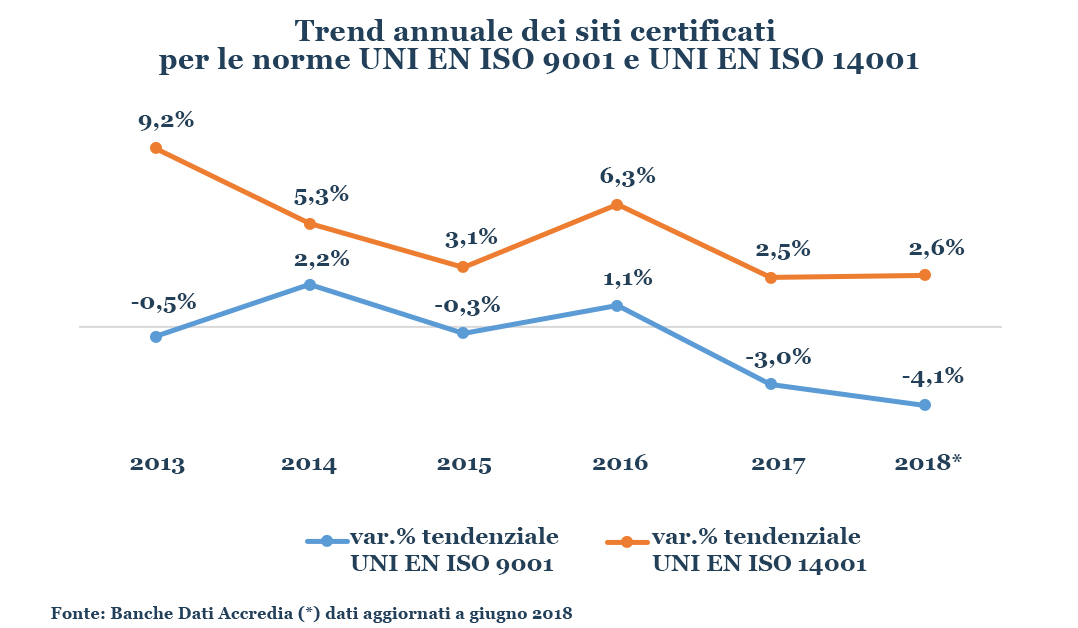 La certificazione del sistema di gestione secondo gli standard ISO 9001 e ISO 14001 ha dunque un valore strategico elevato per le imprese. Non è un caso che siano ancora oggi tra le certificazioni più diffuse in Italia. A giugno 2018, i 95 organismi accreditati per la certificazione dei sistemi di gestione per la qualità avevano certificato circa 122mila siti aziendali, mentre i 40 organismi competenti per l’accreditamento dei sistemi di gestione ambientale ne avevano certificati poco meno di 22mila.