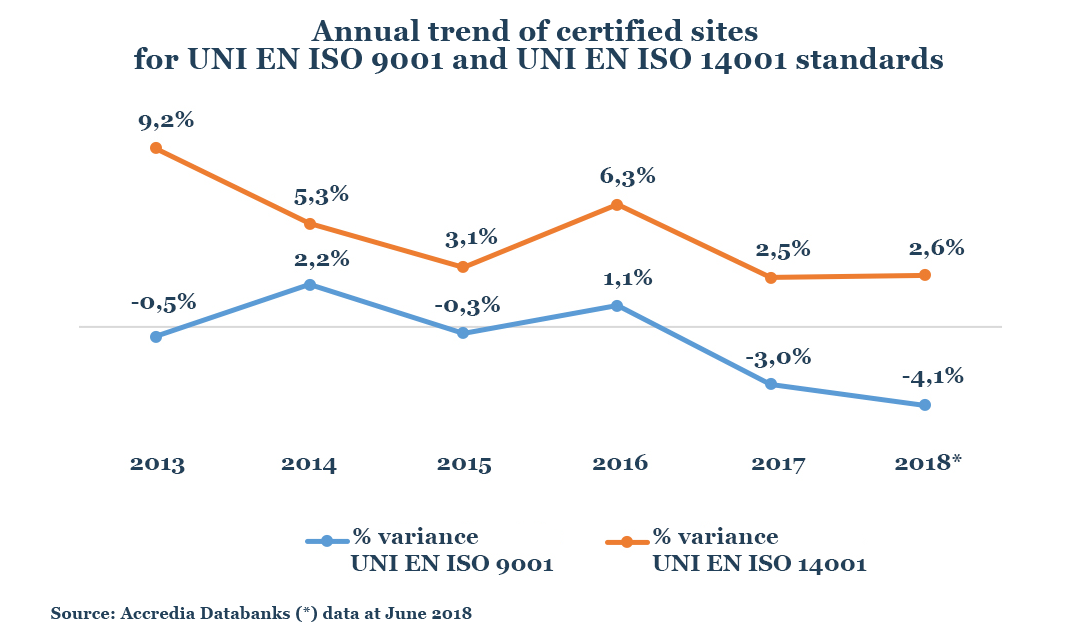 Quality and environmental management systems have therefore been a priority for many Italian companies for a long time, and their market, especially for the UNI EN ISO 9001, is in a phase of maturity of its life cycle, where the annual trend of certified sites demonstrates this trend.