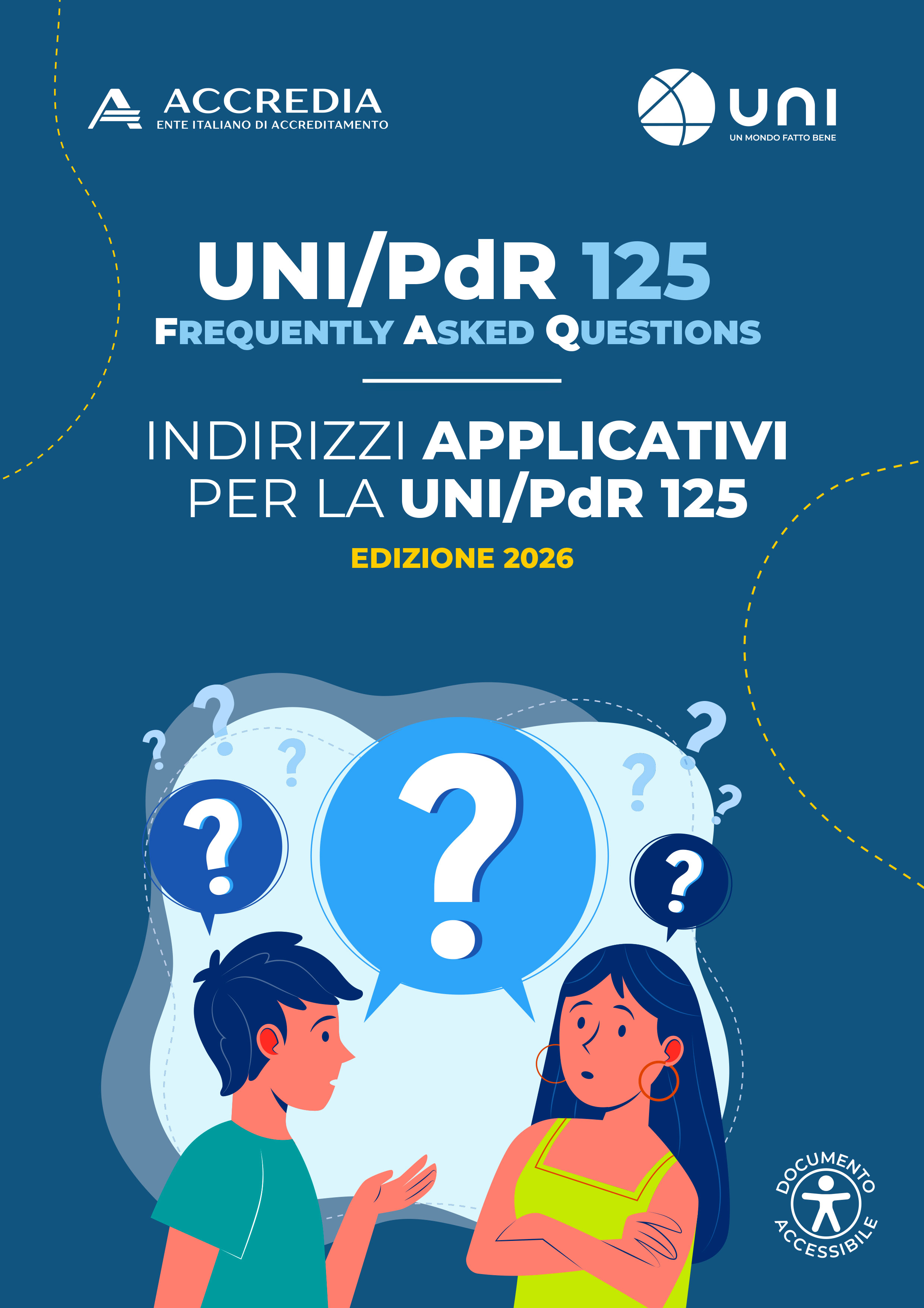 La brochure riporta le risposte di Accredia e UNI in merito a un serie di domande (FAQ) riguardanti l’implementazione e la certificazione del sistema di gestione per la parità di genere secondo la UNI/PdR 125:2022. Le indicazioni si rivolgono alle organizzazioni, pubbliche e private, e agli organismi di certificazione accreditati.